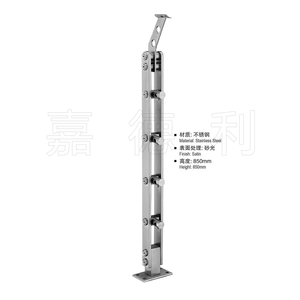 材质多为不锈钢201,304,316广泛应用于楼梯,栏杆,扶栏,扶手的支撑柱,表面一般是磨砂拉丝,或镀金处理。立柱主体板材一般选用6-15MM厚,市场上规格多为高度为850*50MM或1050*50MM,加上玻璃抓手等配件。立柱主体是靠精准切割设备切割出来的,可以切割出各种形状,再钣金加工,玻璃驳接紧固件大都是铸造出来的。