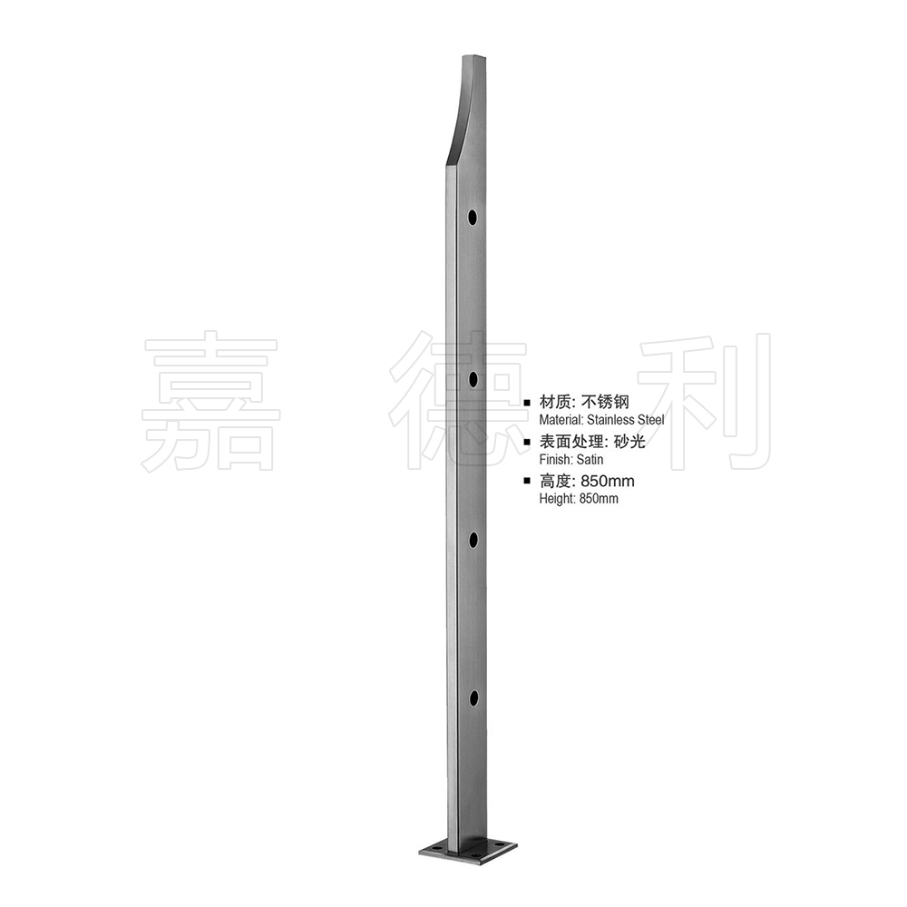 材质多为不锈钢201,304,316广泛应用于楼梯,栏杆,扶栏,扶手的支撑柱,表面一般是磨砂拉丝,或镀金处理。立柱主体板材一般选用6-15MM厚,市场上规格多为高度为850*50MM或1050*50MM,加上玻璃抓手等配件。立柱主体是靠精准切割设备切割出来的,可以切割出各种形状,再钣金加工,玻璃驳接紧固件大都是铸造出来的。