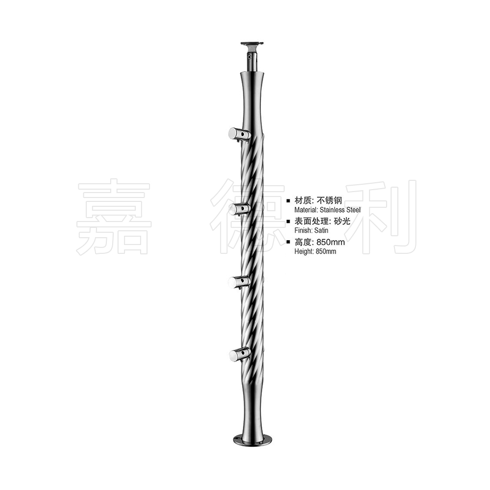 材质多为不锈钢201,304,316广泛应用于楼梯,栏杆,扶栏,扶手的支撑柱,表面一般是磨砂拉丝,或镀金处理。立柱主体板材一般选用6-15MM厚,市场上规格多为高度为850*50MM或1050*50MM,加上玻璃抓手等配件。立柱主体是靠精准切割设备切割出来的,可以切割出各种形状,再钣金加工,玻璃驳接紧固件大都是铸造出来的。