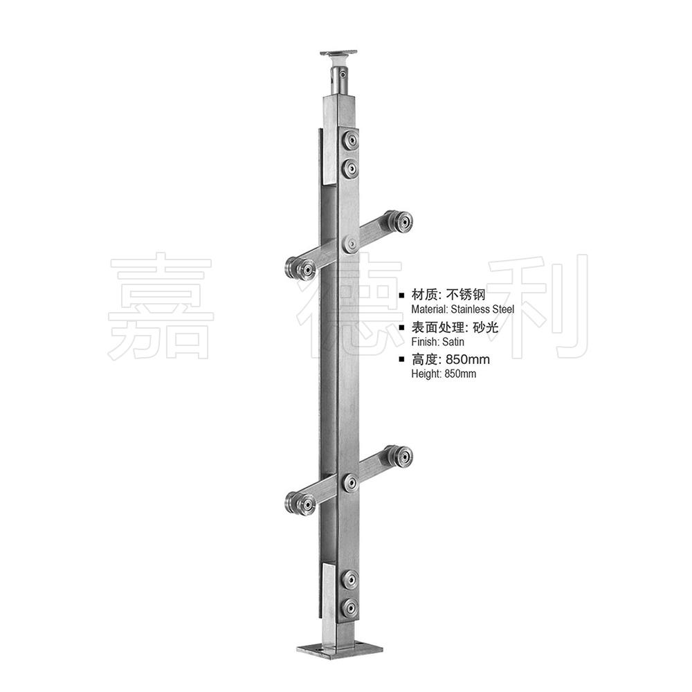 材质多为不锈钢201,304,316广泛应用于楼梯,栏杆,扶栏,扶手的支撑柱,表面一般是磨砂拉丝,或镀金处理。立柱主体板材一般选用6-15MM厚,市场上规格多为高度为850*50MM或1050*50MM,加上玻璃抓手等配件。立柱主体是靠精准切割设备切割出来的,可以切割出各种形状,再钣金加工,玻璃驳接紧固件大都是铸造出来的。