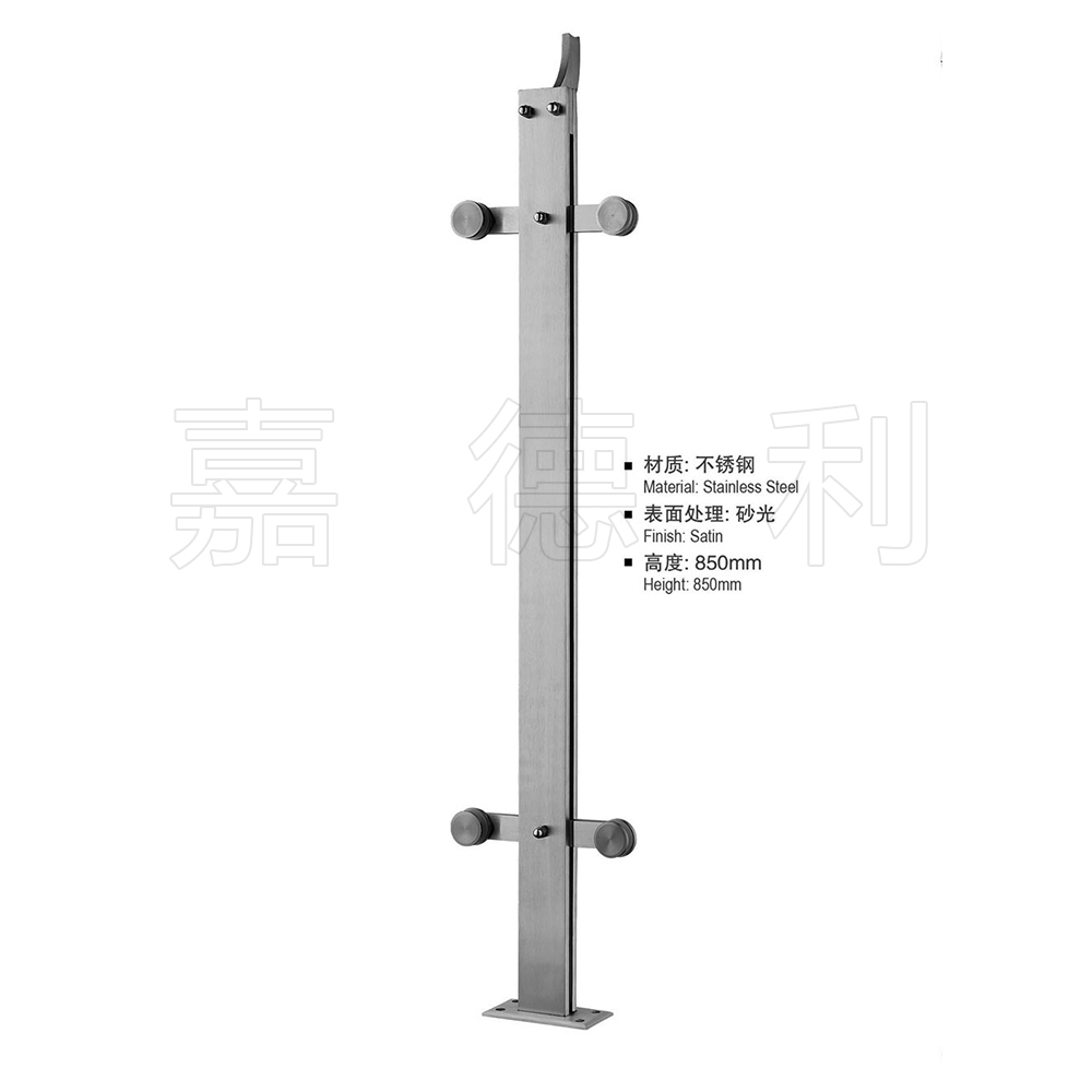 材质多为不锈钢201,304,316广泛应用于楼梯,栏杆,扶栏,扶手的支撑柱,表面一般是磨砂拉丝,或镀金处理。立柱主体板材一般选用6-15MM厚,市场上规格多为高度为850*50MM或1050*50MM,加上玻璃抓手等配件。立柱主体是靠精准切割设备切割出来的,可以切割出各种形状,再钣金加工,玻璃驳接紧固件大都是铸造出来的。