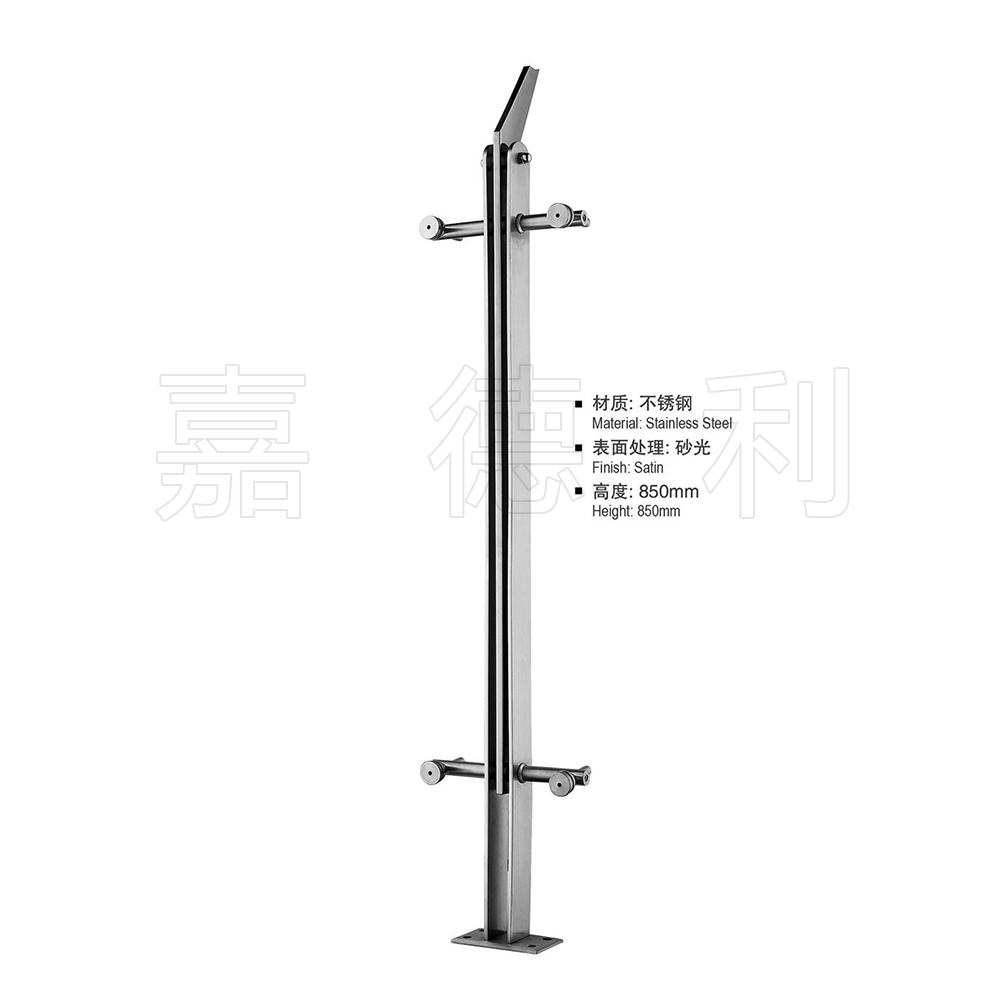材质多为不锈钢201,304,316广泛应用于楼梯,栏杆,扶栏,扶手的支撑柱,表面一般是磨砂拉丝,或镀金处理。立柱主体板材一般选用6-15MM厚,市场上规格多为高度为850*50MM或1050*50MM,加上玻璃抓手等配件。立柱主体是靠精准切割设备切割出来的,可以切割出各种形状,再钣金加工,玻璃驳接紧固件大都是铸造出来的。