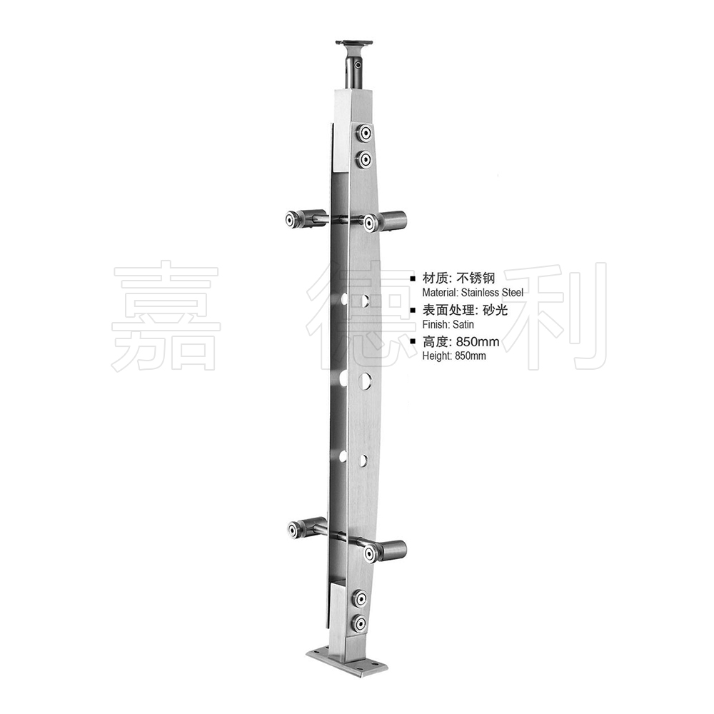 材质多为不锈钢201,304,316广泛应用于楼梯,栏杆,扶栏,扶手的支撑柱,表面一般是磨砂拉丝,或镀金处理。立柱主体板材一般选用6-15MM厚,市场上规格多为高度为850*50MM或1050*50MM,加上玻璃抓手等配件。立柱主体是靠精准切割设备切割出来的,可以切割出各种形状,再钣金加工,玻璃驳接紧固件大都是铸造出来的。