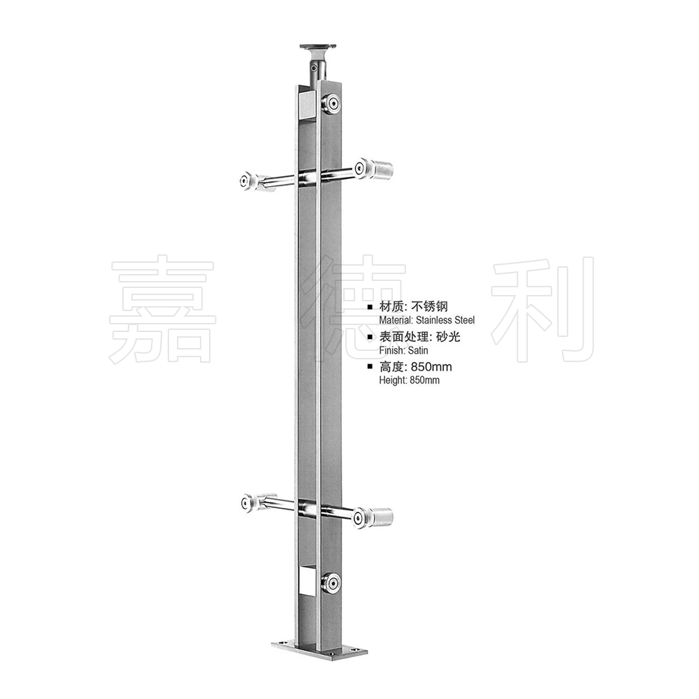 材质多为不锈钢201,304,316广泛应用于楼梯,栏杆,扶栏,扶手的支撑柱,表面一般是磨砂拉丝,或镀金处理。立柱主体板材一般选用6-15MM厚,市场上规格多为高度为850*50MM或1050*50MM,加上玻璃抓手等配件。立柱主体是靠精准切割设备切割出来的,可以切割出各种形状,再钣金加工,玻璃驳接紧固件大都是铸造出来的。