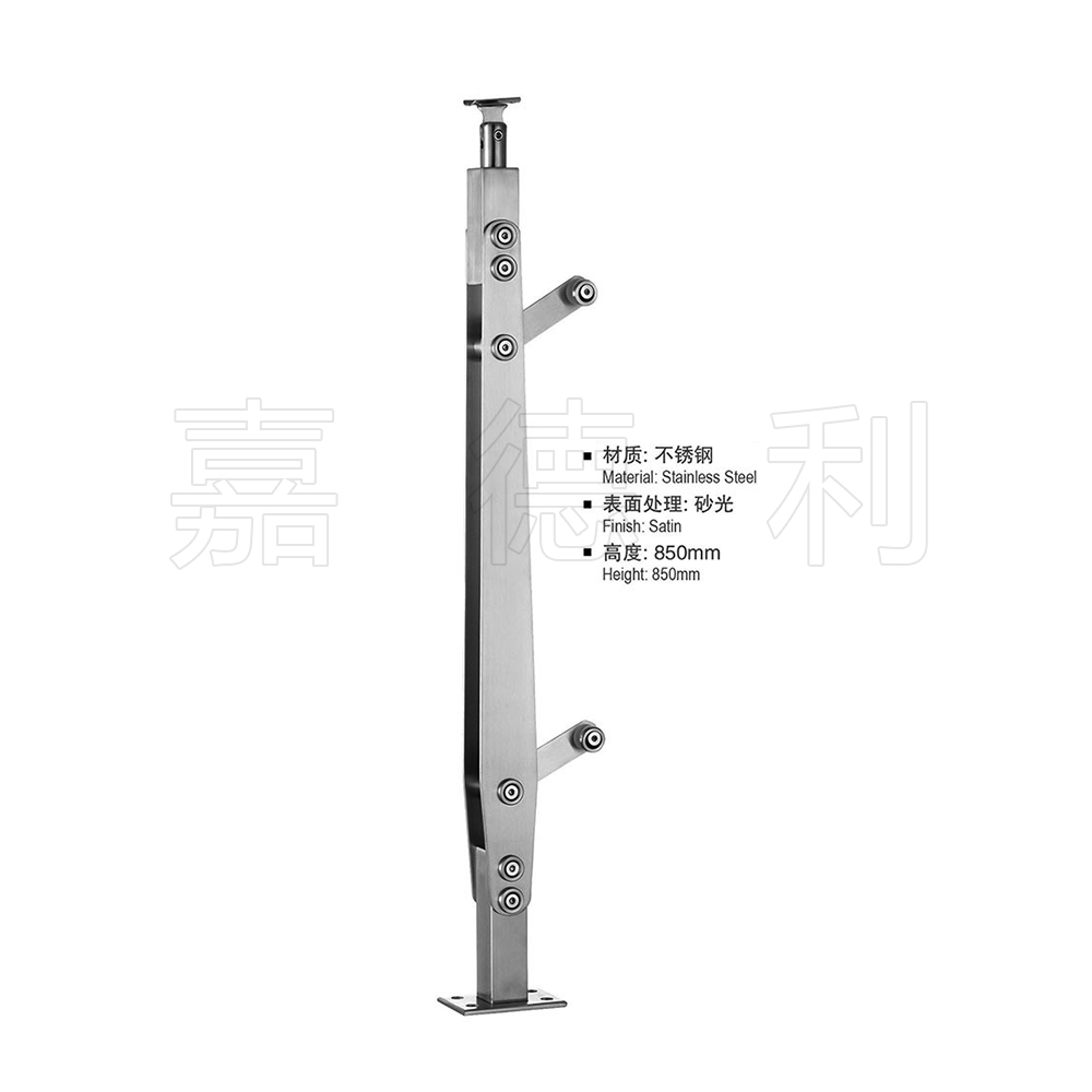 材质多为不锈钢201,304,316广泛应用于楼梯,栏杆,扶栏,扶手的支撑柱,表面一般是磨砂拉丝,或镀金处理。立柱主体板材一般选用6-15MM厚,市场上规格多为高度为850*50MM或1050*50MM,加上玻璃抓手等配件。立柱主体是靠精准切割设备切割出来的,可以切割出各种形状,再钣金加工,玻璃驳接紧固件大都是铸造出来的。
